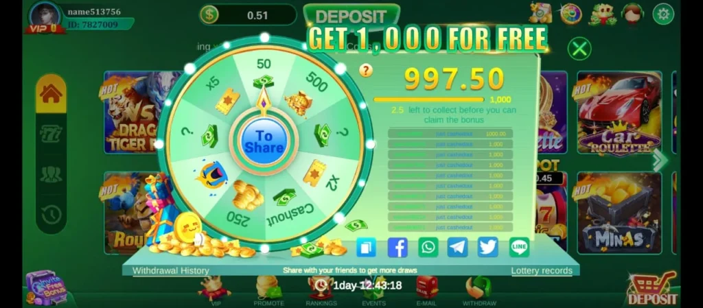 Promoting the game will give you many benefits. You can earn a commission from all your subordinates. You will get a bonus for reaching a certain number of valid players and earn a free spin in the cash wheel.